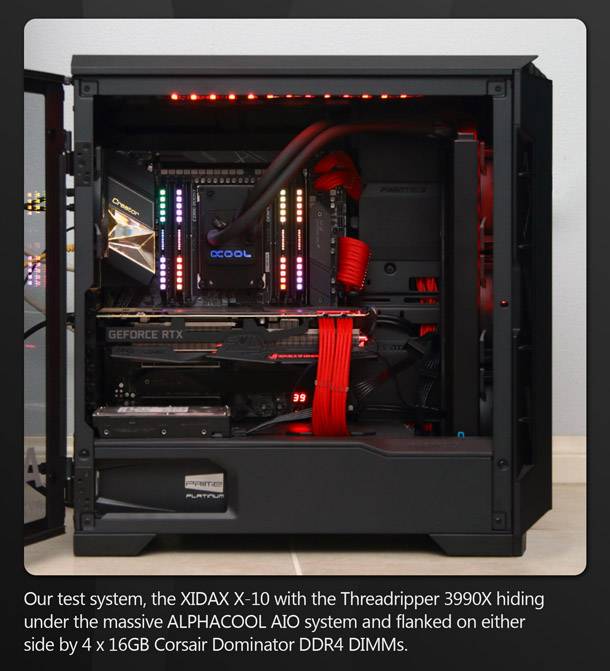 Az AMD jelenleg folyadékhűtőket ajánlja a harmadik generációs 280W-os Threadripper CPU-khoz. A Xidax rendszernek Alphacool 360mm AIO folyadékhűtő került, és fantasztikus munkát végzett a 3990X hűtése terén. Teljes terhelésnél soha nem haladta meg a 67 ° C-ot, messze a névleges 95 ° C-os maximumától.
