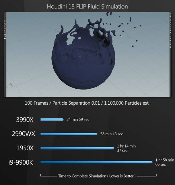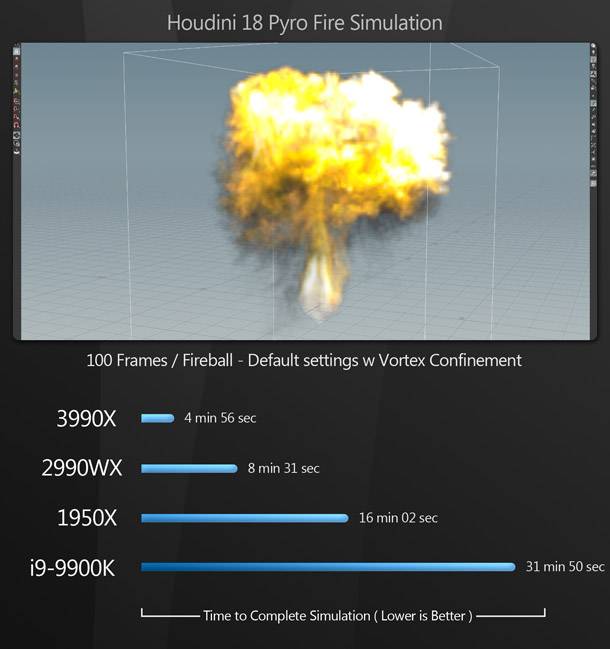 A renderelési benchmarkokhoz hasonlóan, a 3990X a szimulációs benchmarkok során is az első helyet foglalja el, nagy elhatárolódással a többi CPU-tól.  (Érdemes azt is megjegyezni, hogy mindkét Houdini-sim még ennél is gyorsabban lefuthatott volna, ha nem maxolták volna ki a 64 GB RAM-ot a Xidax rendszerben...)