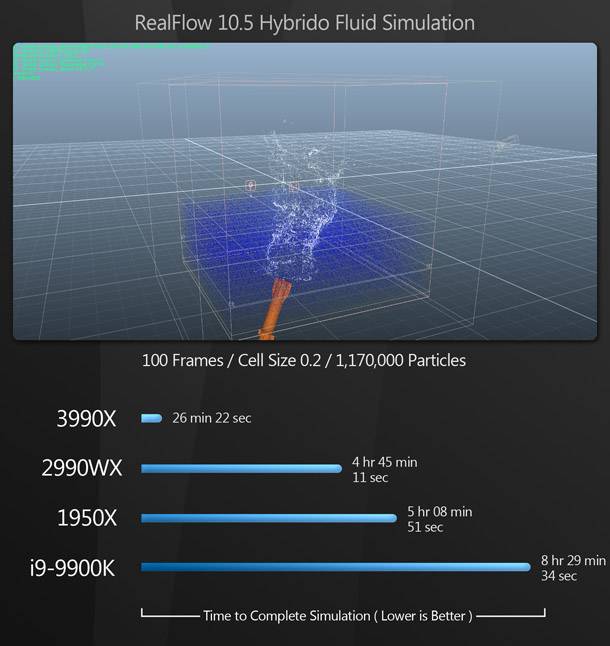 Érdekes a hatalmas teljesítményrés a 3990X és a 2990WX között RealFlow használata közben.