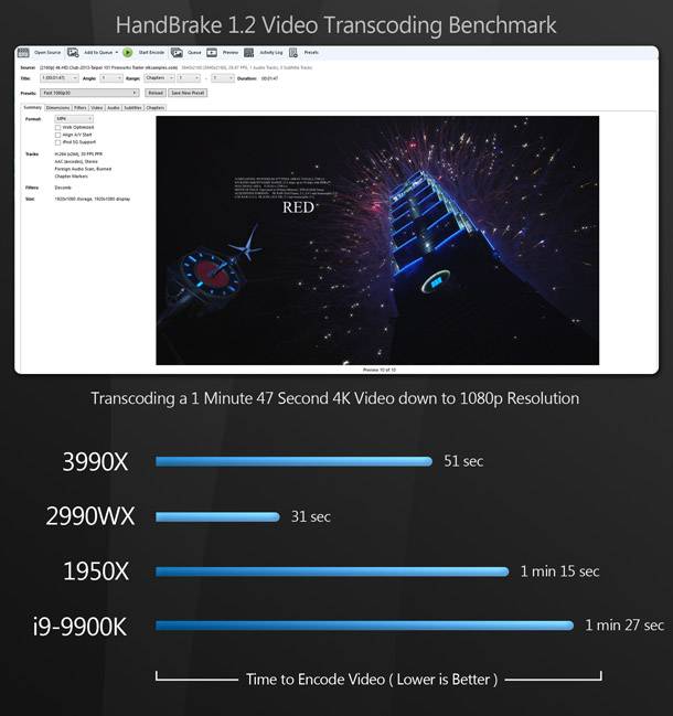 A Threadripper 3990X ezen tesztek mindegyikében is az első helyet foglalja el, egy kivételével: valamilyen okból nem tűnik úgy, hogy nem muzsikál jól a HandBrake video-kódoló eszközzel.