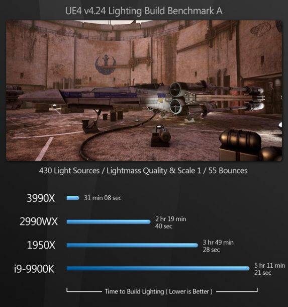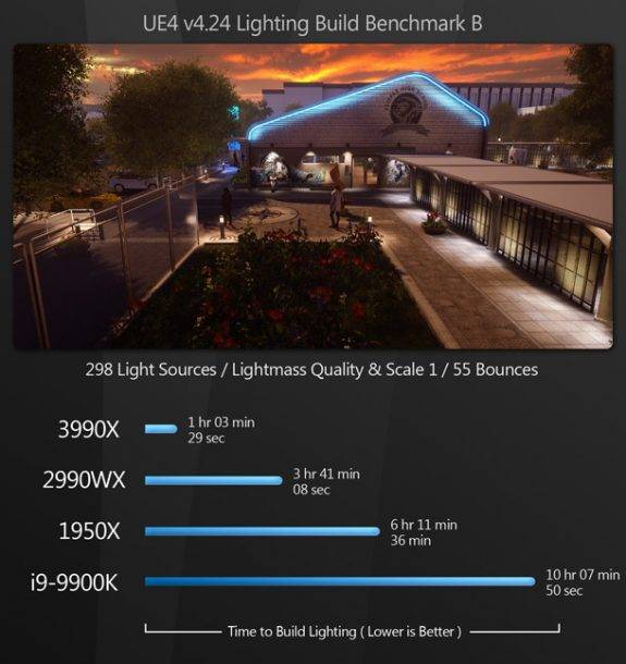 Akárcsak a CPU-renderelésnél, a Threadripper 3990X rendkívül jól kezeli a lightmap baking-et, jóval a 2990WX előtt, és az 1950X és a 9900K bőven porban marad.