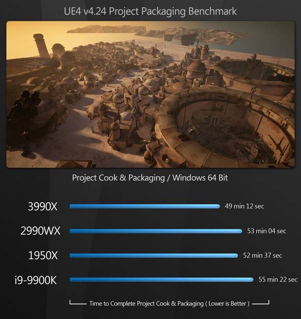 A Threadripper 3990X ismét hatalmas vezetést szerez a CPU többi része felett. Annak ellenére, hogy itt nem csináltam benchmarkot, az UE4 munkafolyamatainak ez egy olyan része, amelyben a sok maggal rendelkező CPU-knak teljesítménynövekedést kell kezdeményezniük, pontosan akkor, amikor egy projektet először töltünk be, vagy akár egy meglévő projektet áthelyezünk az Unreal Engine új verziójára, vagy áthelyezzük a számítógépek között a projektet. Mint minden esetben, a rendszernek itt is újra kell cache-elnie az adatokat és újra kell számolnia a shadereket.