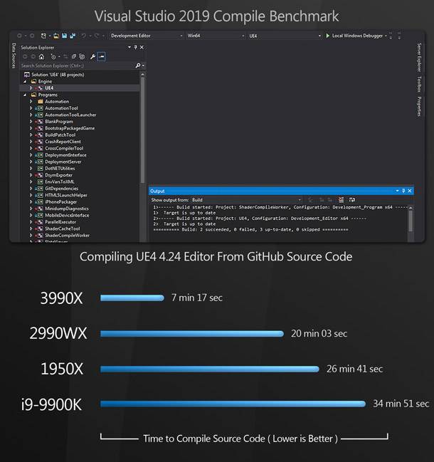 A végső UE4-hez kapcsolódó benchmark a Visual Studio 2019 felhasználásával fordítja az Unreal szerkesztőjét a saját forráskódjából.