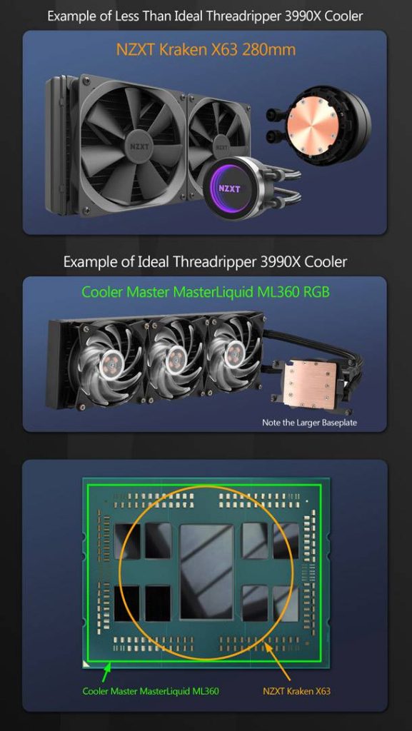 A Threadripper CPU-khoz használható, nagyított érintkezőlemezzel ellátott AIO folyadékhűtő például a Cooler Master MasterLiquid ML360.
