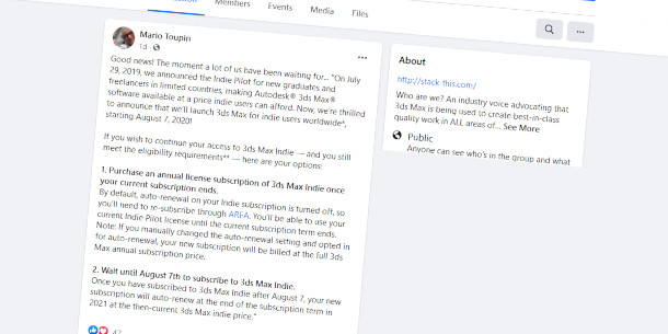 Az e-mail szerint, melyet a 3ds Max Indie user-ek osztottak meg a 3ds Max Facebook csoportban, a cég "augusztus 7-től világszerte útjára indítja a 3ds Max-ot indie felhasználók számára"