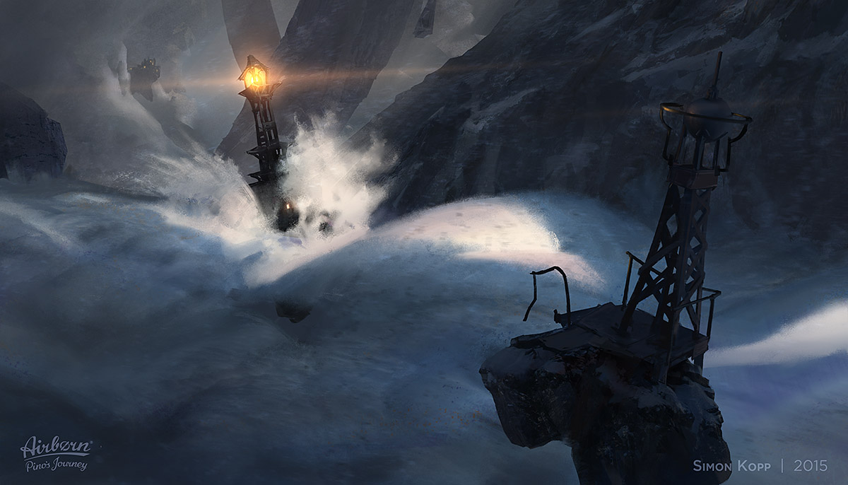 Airborn – Piño’s Journey concept art. A projekt egy Zelda-szerű minijáték létrehozására tett kísérletként indult, s az environment design homokozójává vált. "Az egész csak szórakozás" - mondja Simon