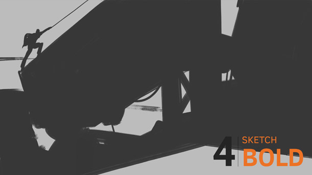 Sok időt megtakarítasz azzal, ha a finomítást későbbre hagyod. Kezdd a nagyobb alakzatokkal. Ez akkor is érvényes, ha egy environmentet készítesz blockmesh-ekkel, de akkor is, ha fekete-fehér 2D sketch-eket csinálsz izgalmas sziluettekkel.
