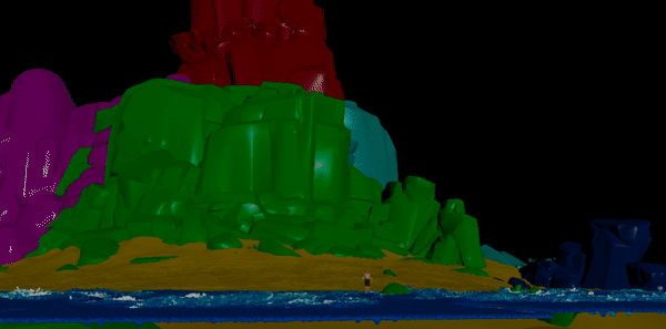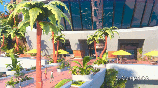 Annak érdekében, hogy csökkentsük a lighting és sim update-k átfutási idejét, valamint hogy minimalizáljuk a közeli jelenetek defocus problémáit, több renderre osztottuk a szigetet. A kameramozgás összetettsége miatt nem volt nyilvánvaló, hogy hogyan osszuk szét, ezért deep compositing-et használtunk a shot Nuke-on belüli "újraépítéséhez"