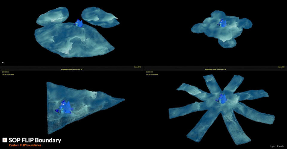A Houdini 19.5-ben frissültek a FLIP folyadékszimulációs munkafolyamatok, úgymint up-resing szimuláció, illetve az, hogy FLIP-szimulációhoz egy tetszőleges alakzatot is használhatunk boundary-ként, ahogyan az a fenti képen is látható.