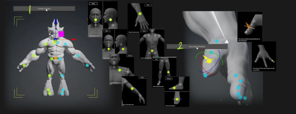 Az AccuRIG gomb megnyomásával a tool analizálja a mesh-t, majd joint-okat reprezentáló pont-okat helyez el nagyjából helyes pozíciókban. A pontokra rákattintva beállítom azok helyét az interfész tetején látható diagramokat követve. A művelet felgyorsításához a symmetry function van segítségemre, amit deaktiválok, ha a karakter egy része nem szimmetrikus. Következő lépésként definiálom a digit-eket - ebben az esetben 3 - majd rányomok a Generate Skeleton opcióra.