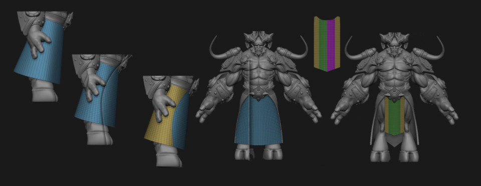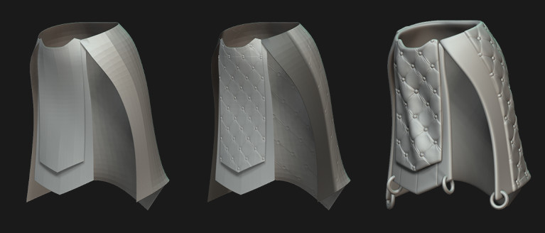 Ehhez a karakterhez nem kell sok szövet, csak egy pár lemez, ami a lábak egy részét fedi. Az övet alapként használva extrudálást végzek, megtartva az érdekelt részt, majd addig igazítom a formát, amíg el nem érem a kívánt eredményt. A Dynamic subdivison-nel tudok síkkal dolgozni, miközben képet kapok a végső darab vastagságáról.