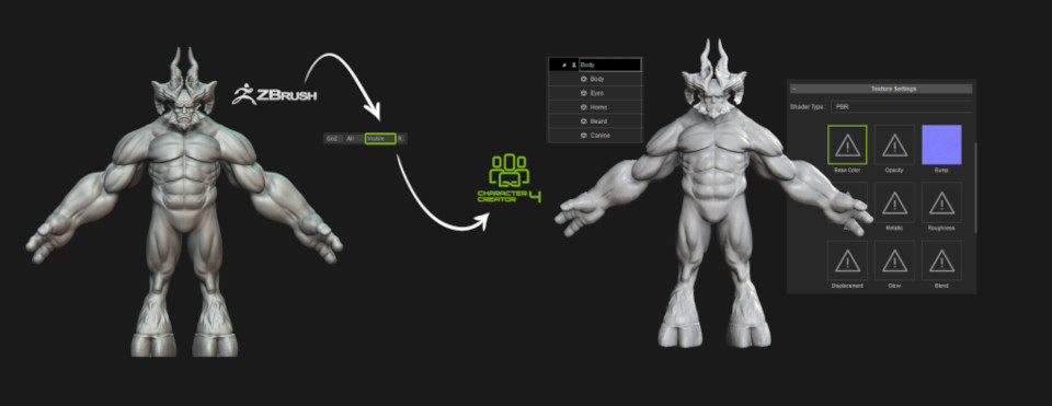 Már korábban is lehetőség volt egy karakter átvinni ZBrush-ból Character Creator-ba vagy fordítva, de CC3-ban nem módosíthattuk a base mesh topológiáját, így a karakterkészítés elég korlátozott volt. A CC4 megjelenésével az összes standard ZBrush sculpt-olási technikai alkalmazható a szükséges módosítások elvégzéséhez.
