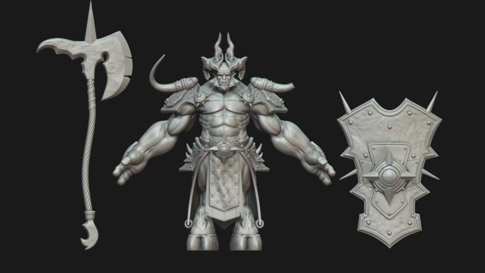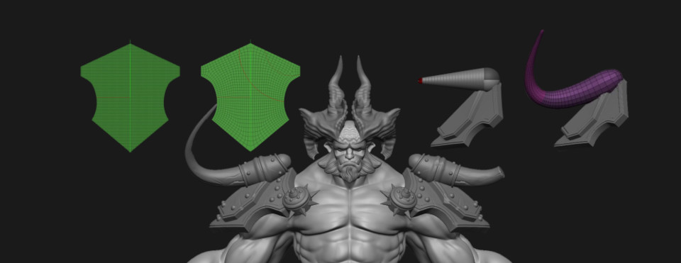 A Sculpt ZRemesh-errel történő retopózása és subdivison levelek hozzáadása után elkezdem finomítani az alakzatokat. Végül megkapja az agyarakat, a szakáll többi részét és a szarvakat is.