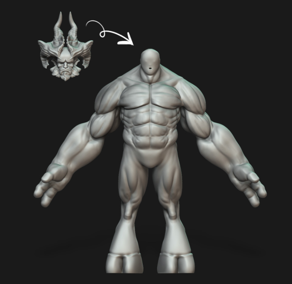 Ha elégedett vagyok az anatómiai formákkal, merge-lem a fejet a testtel, itt is a DynaMesh-t használva.
