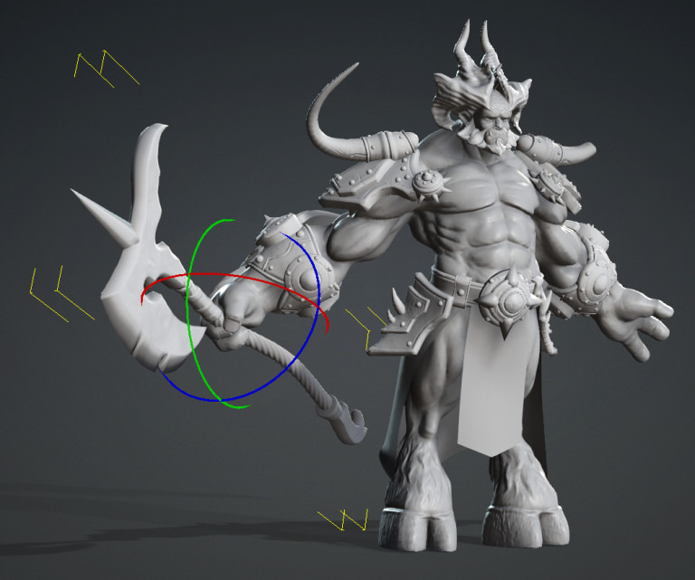 A pivot pont-ot a fejsze közepére teszem, elhelyezem a kezében, majd megnézem hogyan működik animáció közben. Ezeket a lépéseket követem a pajzs esetén is.