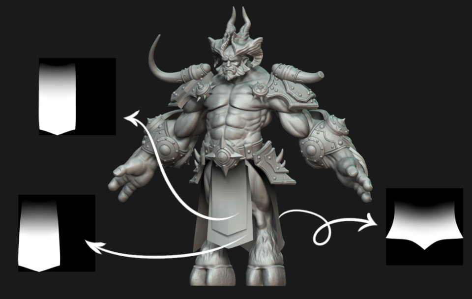 Az egészet fehérre festem, azokat a részeket melyeket nem akarom, hogy deformálódjanak pedig feketére. Mivel magas polygon számmal dolgozom a festék enyhe soft-olásával lágyíthatom a színátmeneteket. Minden darabhoz kicsomagolom az UV-ket, és a Polypaint színeiből készítek egy texture map-et.