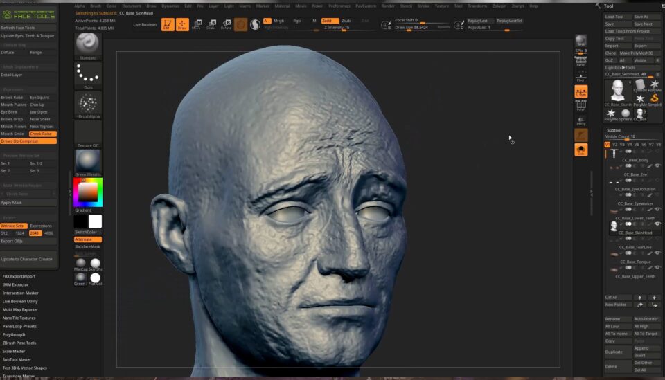 Ezenkívül a ZBrush Face Tools automatikus wrinkle map-et is generál az ultra-high subdivison level-ekről. Ezek a textúrák használhatóak a CC dynamic wrinke rendszerében, soha nem látott valósághűséget kölcsönözve az arckifejezéseknek.