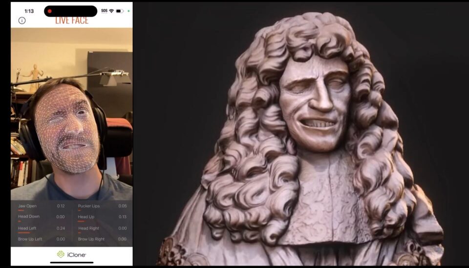 A folyamat hihetetlenül intuitív és gördülékeny, Michael az Iphone-ján vette fel az arcmozgásokat a Reallusion Live Face app-al.