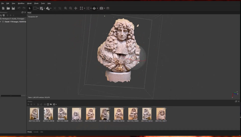 A Metashape fotogrammetriai szoftverrel Michael elkészítette Rupert herceg mellszobrának 3D-s modelljét a British Museum-ban készült forrásfotók alapján.