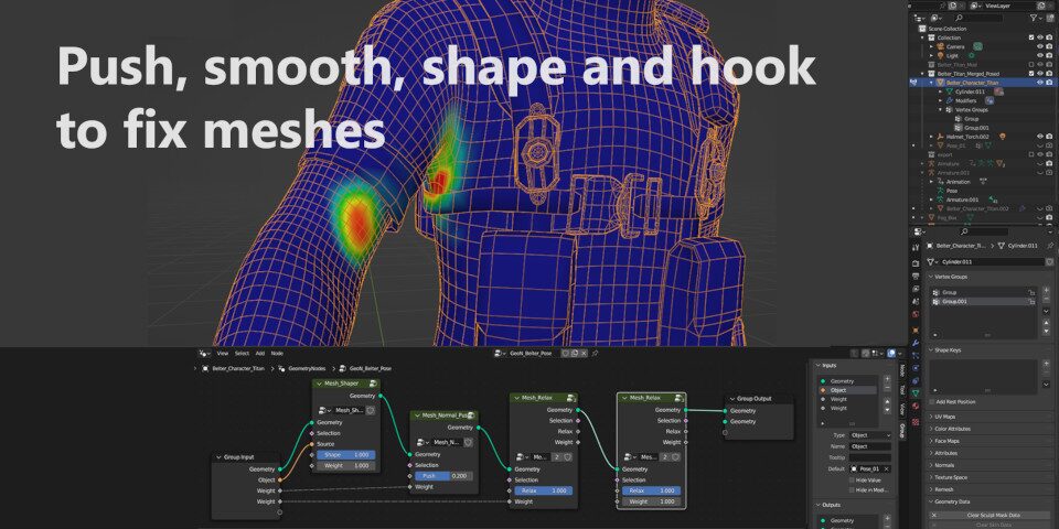 Az add-on nyolc Geometry Node-t tartalmaz a karakter mesh-ek módosításához, és úgy tervezték, hogy Blender-ben is elérhetővé tegye a Maya-ban és egyéb DCC tool-ban lehetséges munkafolyamatokat.