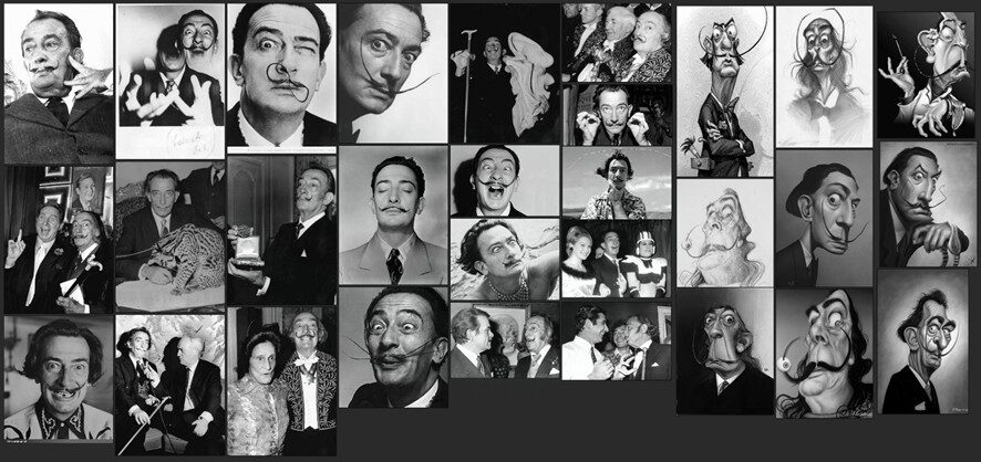 Salvador Dalí-t választottam alanyomként, így első lépésként referenciaképet és karikatúrákat gyűjtök róla útmutatásként.