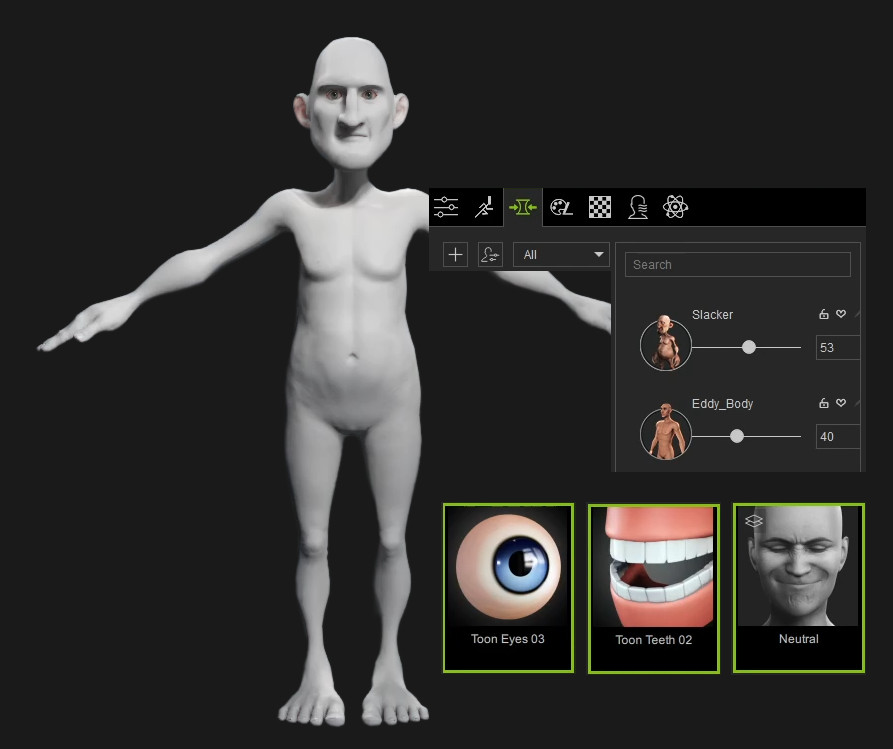 A Character Creator base modelljével kezdek, melyet a CC4 morph vezérlőkkel testreszabok, 0-ra csökkentve a textúra erősségét, hogy a test formájára tudjak összpontosítani. Ezt követően a Neutral set-et használva beload-olom a szemeket, fogakat és mimikai ráncokat.
